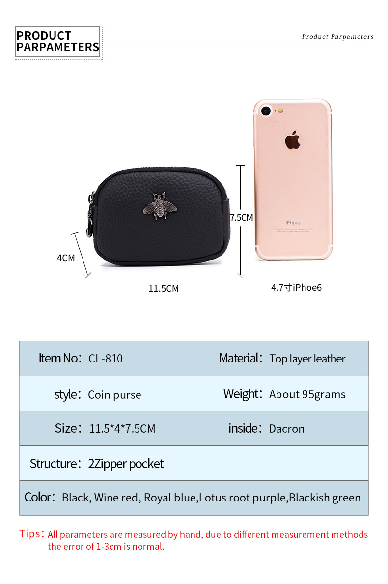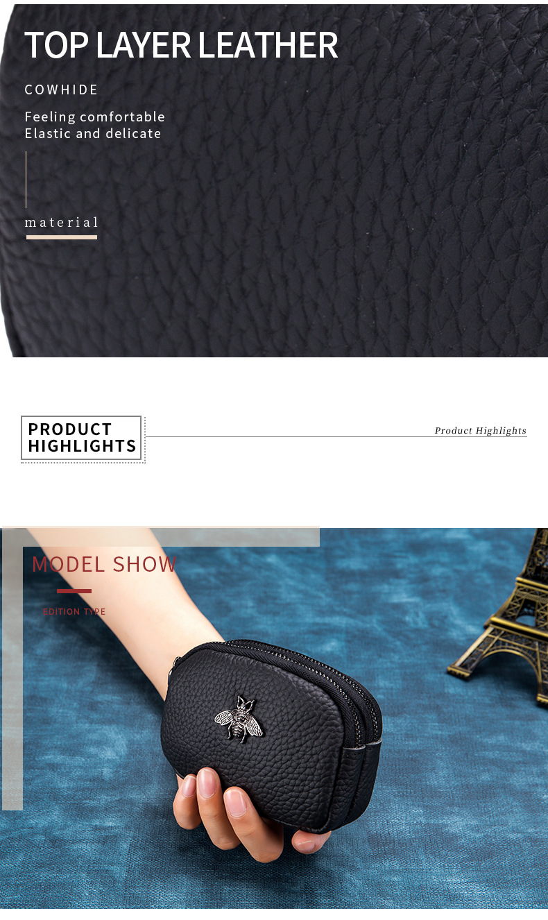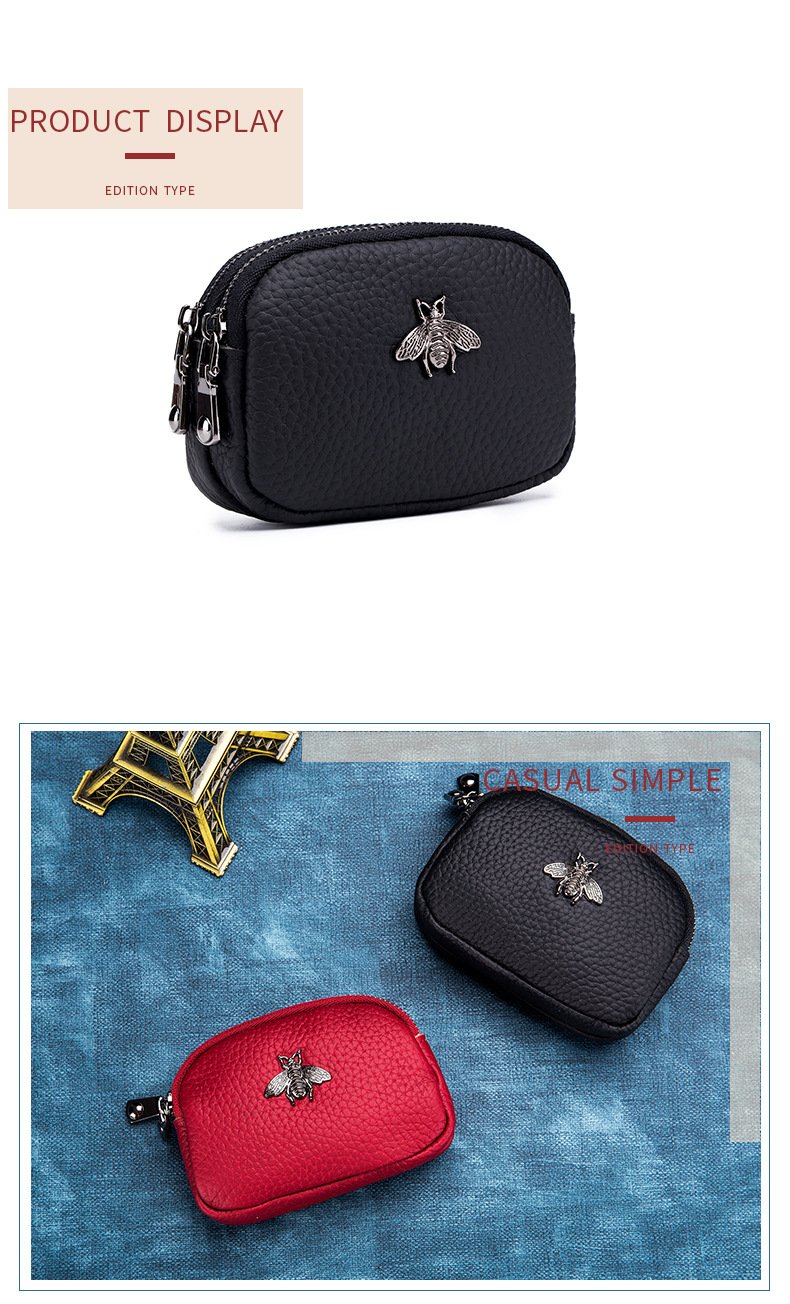 Кошелек для монет из натуральной кожи с милым логотипом пчелы и двойной молнией.